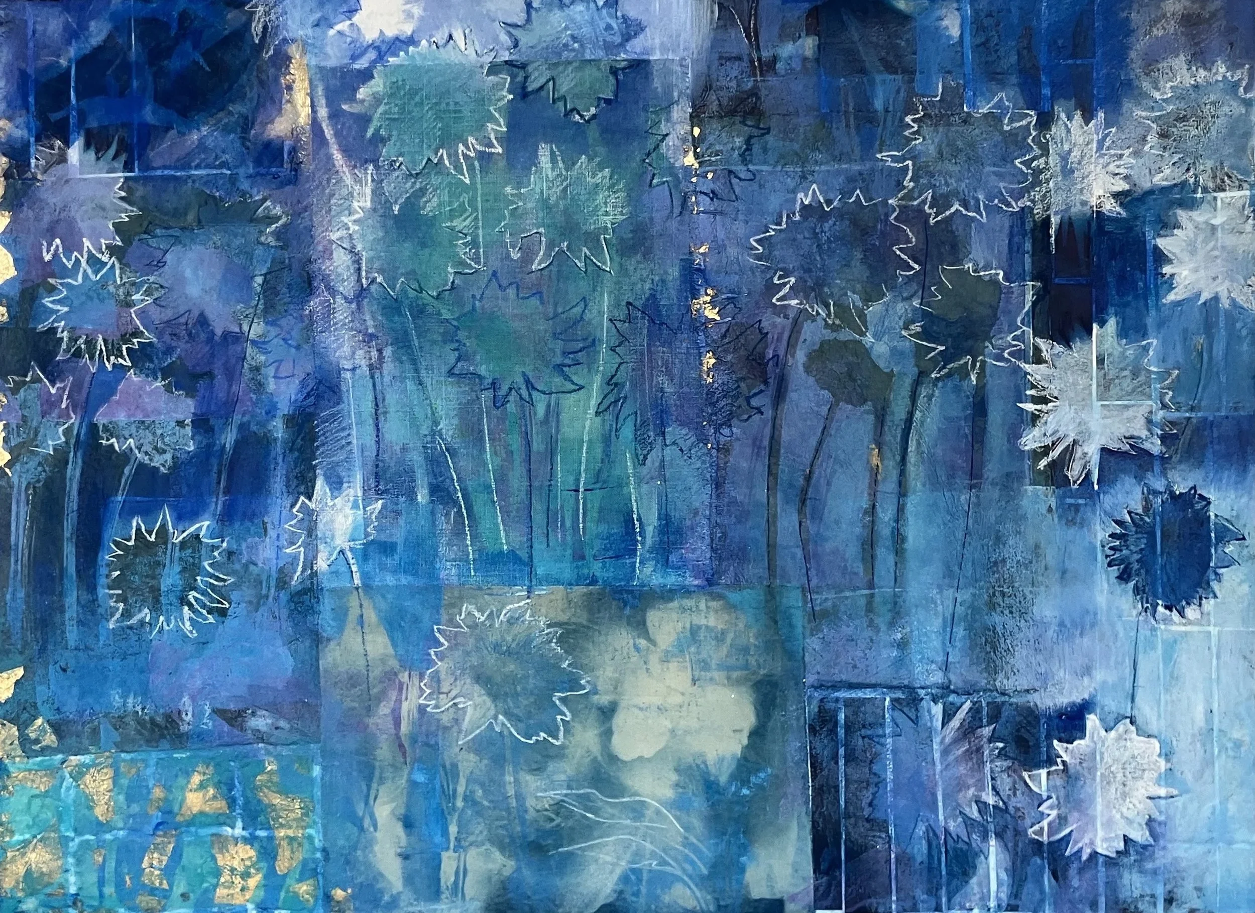 Exploring themes of time and memory through the minuscule to the enormous, the ephemeral to the infinite, the flora to the cosmic. Working in mixed media, cyanotype experiments, and bio prints, in my backyard studio in the Pacific Northwest.